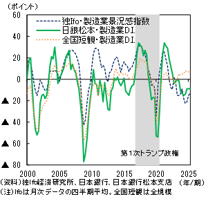 一方、長野県内の製造業は全国とは異なり、業況判断D.I.がマイナス圏に沈んでいる。県内製造業は中国および西欧向け輸出のウエイトが相対的に高く、外需環境がドイツ製造業と類似していることが示唆される。実際、ドイツ経済の停滞と連動する形で、県内製造業の業況感も低迷しており、今後の欧州経済の動向が県内景気に与える影響について注視が必要である(詳細はレポートをご覧ください)。