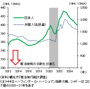 25年に入り、日本人宿泊者数の減少が顕著となっている。物価高による実質賃金の低下や消費マインドの冷え込みに加え、宿泊料の高騰が需要を抑制している可能性がある。インバウンド客の急増により宿泊地の偏在が進む中、日本人宿泊者もまた特定地域への集中傾向を強めており、宿泊地の分散は進んでいない。ハーフィンダール・ハーシュマン指数による分析では、コロナ禍前と比較して宿泊地の集中度がむしろ高まっていることが示されている(図表)。