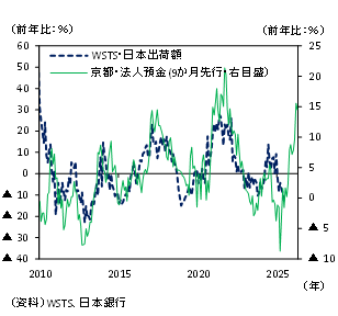 在庫調整の最終段階とAI需要の広がりを背景に、日本の電子部品産業は5年ぶりに回復局面入りの可能性がある。エッジデバイスの普及やAIサーバー向け部品投入が追い風となり、汎用部品セクターにも波及効果が期待される。さらに、京都企業の法人預金が増加傾向にあり、増産準備の兆しがみられる(図表)。ただし、トランプ関税や、世界的な半導体サイクルのピークアウトや地政学リスクには注意が必要だろう(詳細はレポートをご覧ください)。